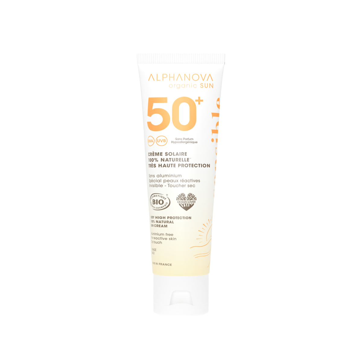 Crème solaire sensible 100% naturelle**, hypoallergénique, sans parfum, spécialement formulée pour les peaux réactives, ou intolérantes aux filtres chimiques. Très haute protection SPF 50+ avec une double protection immédiate UVB & UVA testée en laboratoire indépendant.