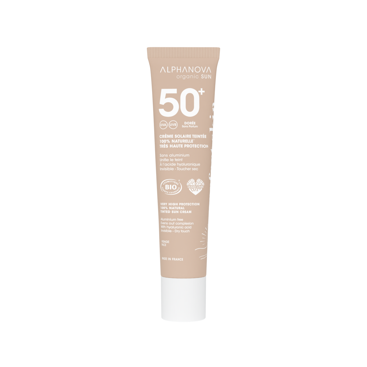 Cette crème solaire teintée dorée SPF 50+ est une protection visage 100% naturelle** et sans parfum. Sa texture invisible au toucher sec est enrichie en acide hyaluronique.